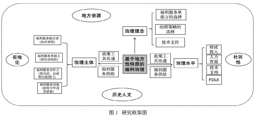 本文提出了一个“基于地方性特质的福利治理”的概念框架,旨在强调在多元福利主体共同参与福利服务的提供过程中,需要考虑融入地方特点。本文从治理理念、治理主体(关系)、治理工具、治理水平(成效)四个维度进行分析,并结合实证材料来描述青少年热线服务平台的福利提供情况,探讨心理服务福利提供中存在的问题及其原因。此外,本文还将分析群团组织在基层福利实践中的具体情况,以系统地论证基于地方性特质的福利治理的运作机制(图1)。这不仅为理解中国基层福利实践提供了另一视角,也为探索社会心理服务体系建设国家政策在地方层面的应用提供了研究方向。