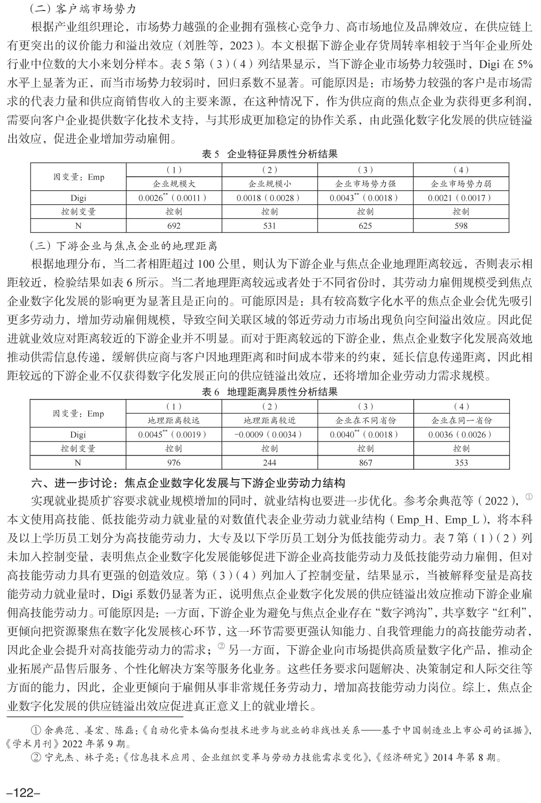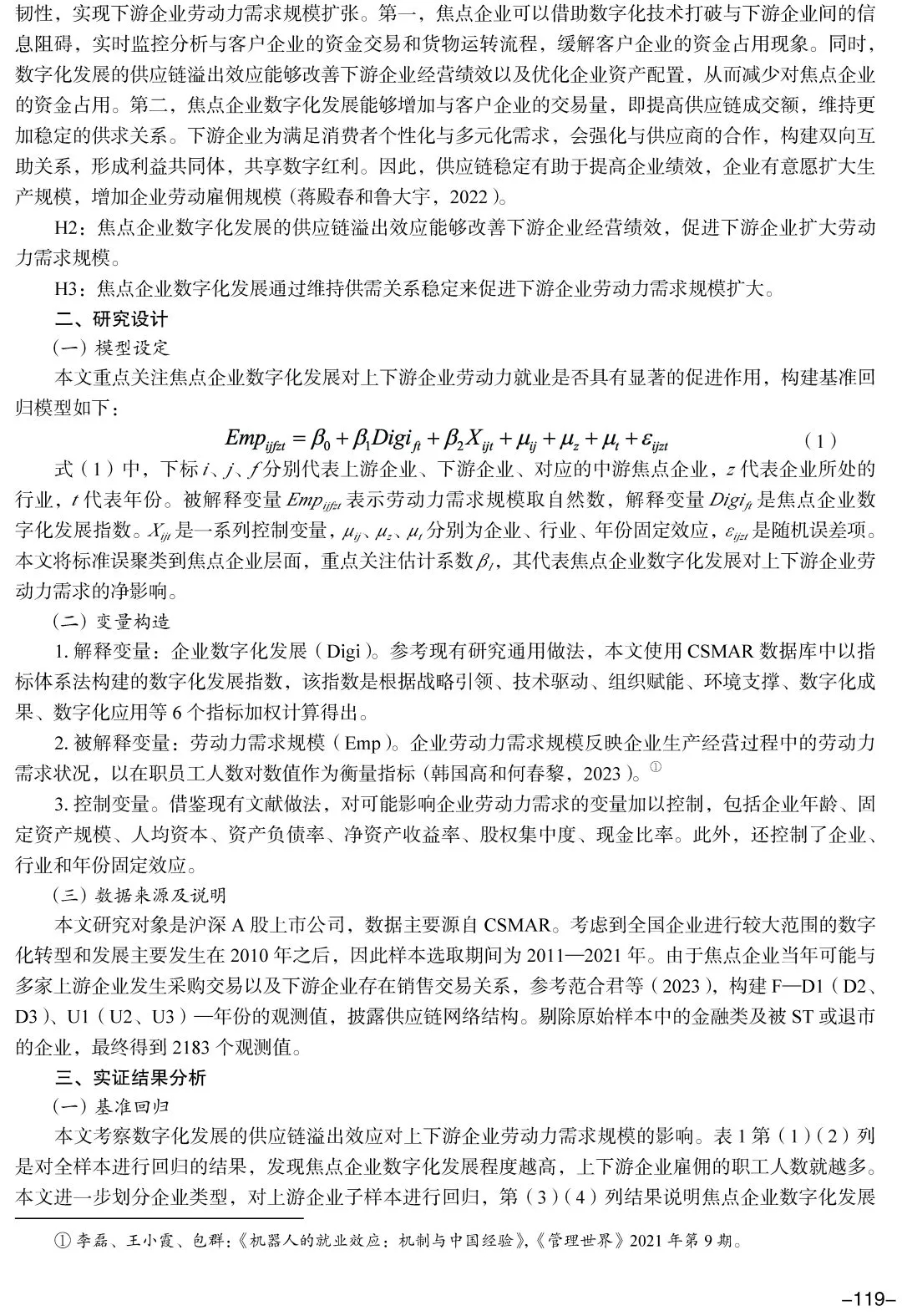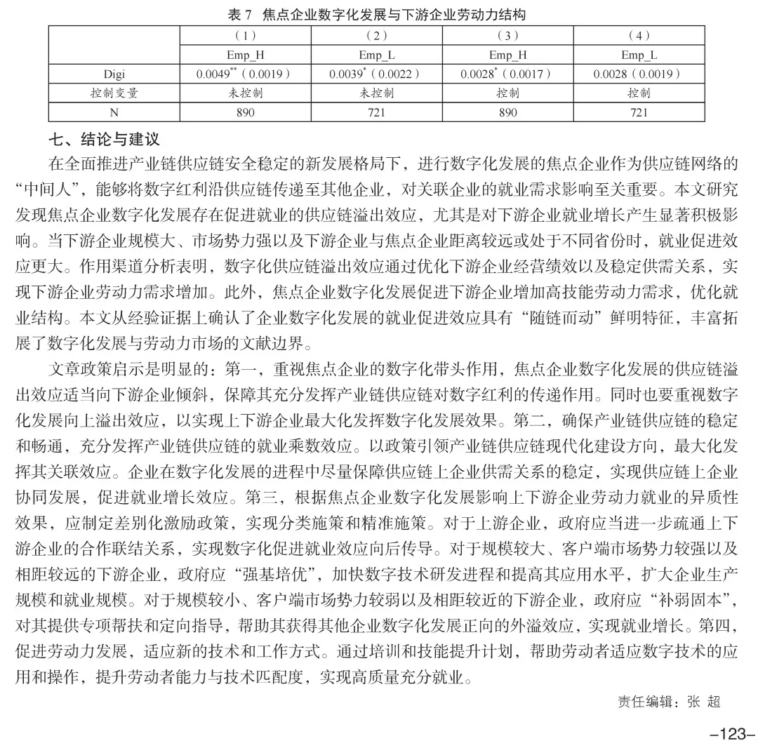 [摘 要]  “稳就业、促就业”是保障基本民生和经济社会稳定的基石,企业数字化发展为就业增长提供了新契机。本文构建2011—2021年的“焦点企业—下游企业(上游企业)”的年度数据集,从供应链关联视角考察焦点企业数字化发展的就业增长效应。研究发现,焦点企业数字化发展显著促进下游企业劳动力就业需求,但对上游企业的就业影响不显著。当下游企业规模大、市场势力强、与焦点企业距离较远或处于不同省份时,就业促进效应更大。其作用渠道在于,焦点企业数字化发展通过优化下游企业经营绩效和维持稳定供需关系来促进下游企业增加劳动力需求。此外,焦点企业数字化发展促进了下游企业增加高技能劳动力需求,使得劳动力需求结构升级。