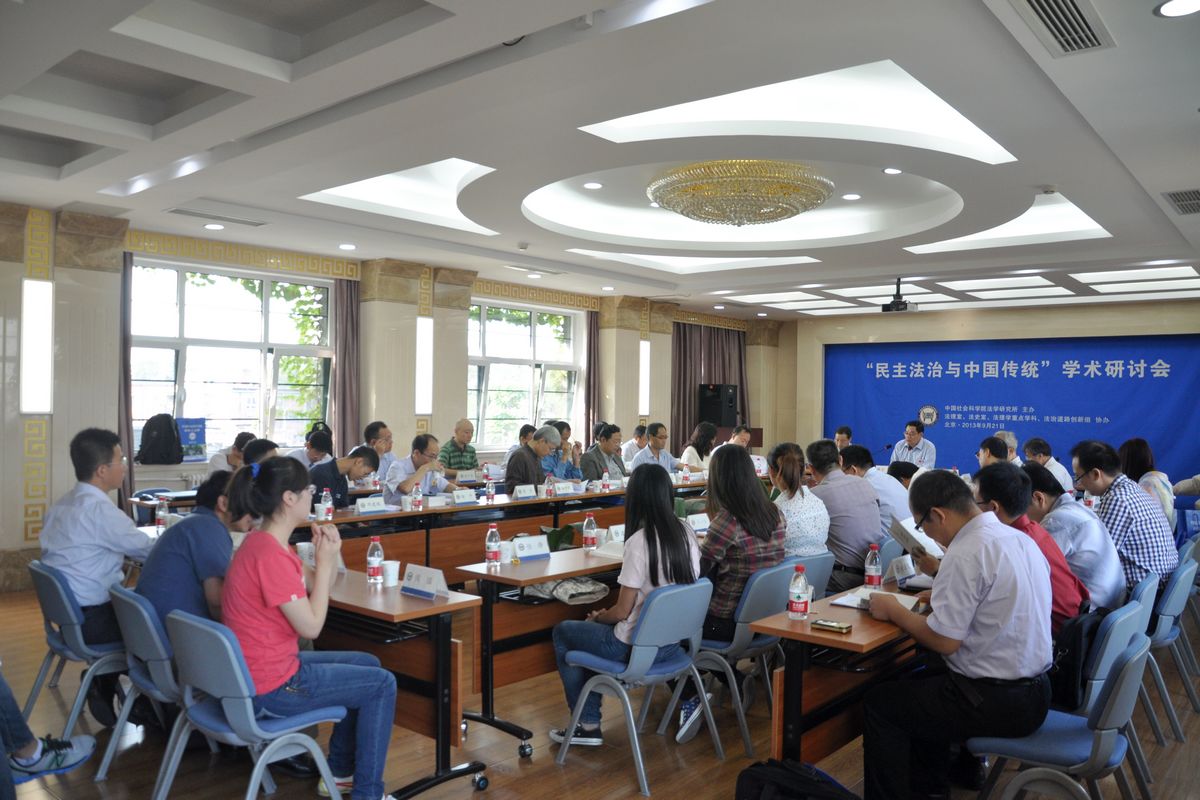 "民主法治与中国传统"学术研讨会,于2013年9月21日在中国社会科学院法学研究所召开。会议在文化自觉自信、文化大发展大繁荣语境下,分"中国法治的历史和文化根基"、"法治现代转型及其乡土语境"、"文化传统与现代治道"、"法家法治与民主法治"四个单元,对"民主法治与中国传统"作了广泛而深入的研讨。来自中国人民大学法学院、国学院、国际关系学院,清华大学法学院,北京大学法学院,中国政法大学,中央党校政法部,中央财经大学法学院,中央民族大学法学院,北京师范大学法学院,北京航空航天大学法学院、人文与社会科学高等研究院,北京交通大学法学院,首都经济贸易大学法学院,浙江大学法学院,厦门大学法学院,吉林省社会科学院,中国社会科学院法学研究所、国际法研究所,《法学研究》、《环球法律评论》、《中国社会科学》杂志社等单位的50多位专家学者出席了会议。中国社会科学院法学研究所副所长莫纪宏,学部委员、法学研究所所长李林,法学研究所、国际法研究所联合党委书记陈甦到会并致辞。